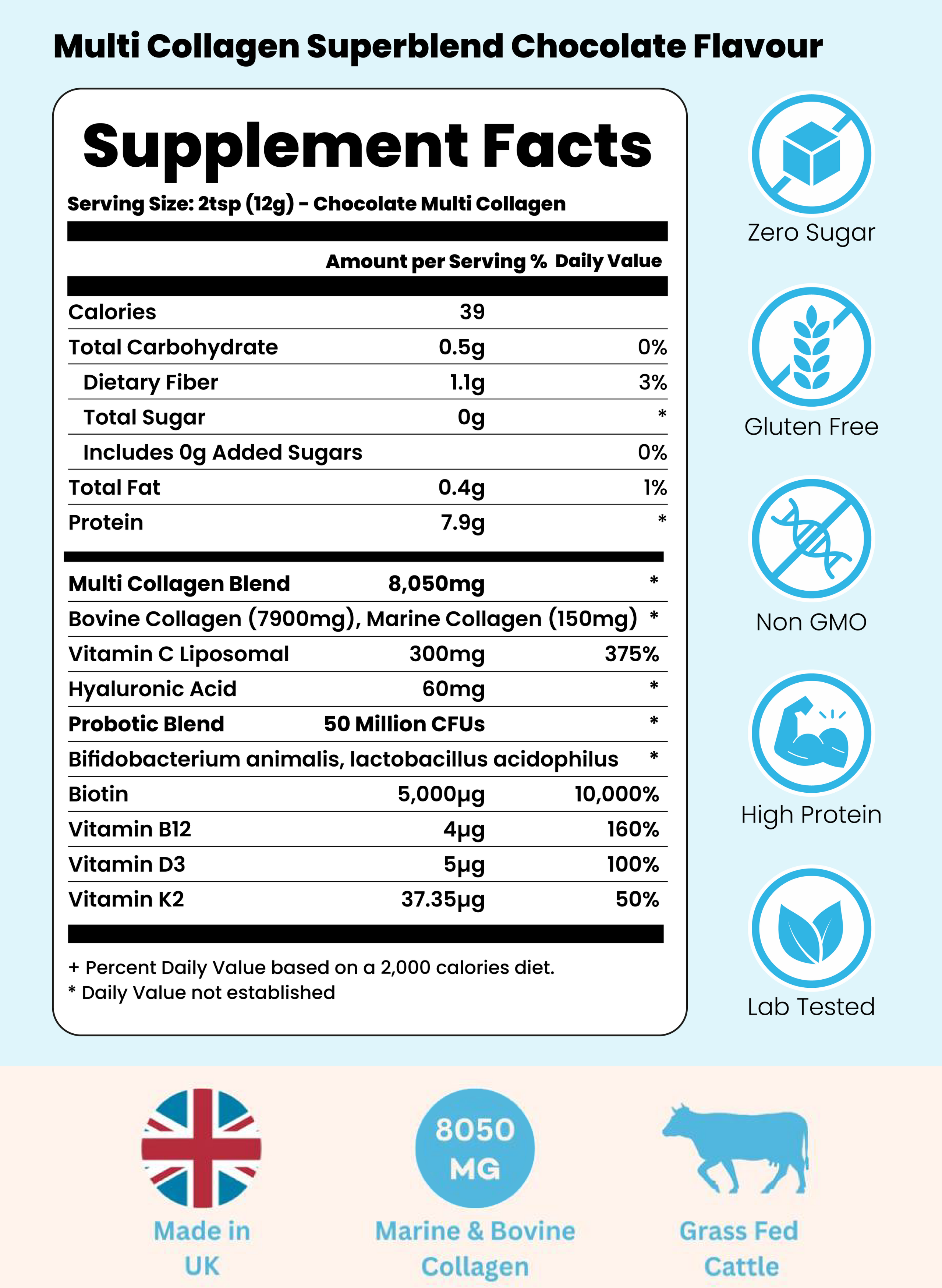 A serving contains 8050mg of Grass Fed Bovine & Wild Caught Marine Collagen, a highly potent dose that's 10X larger than standard capsules.