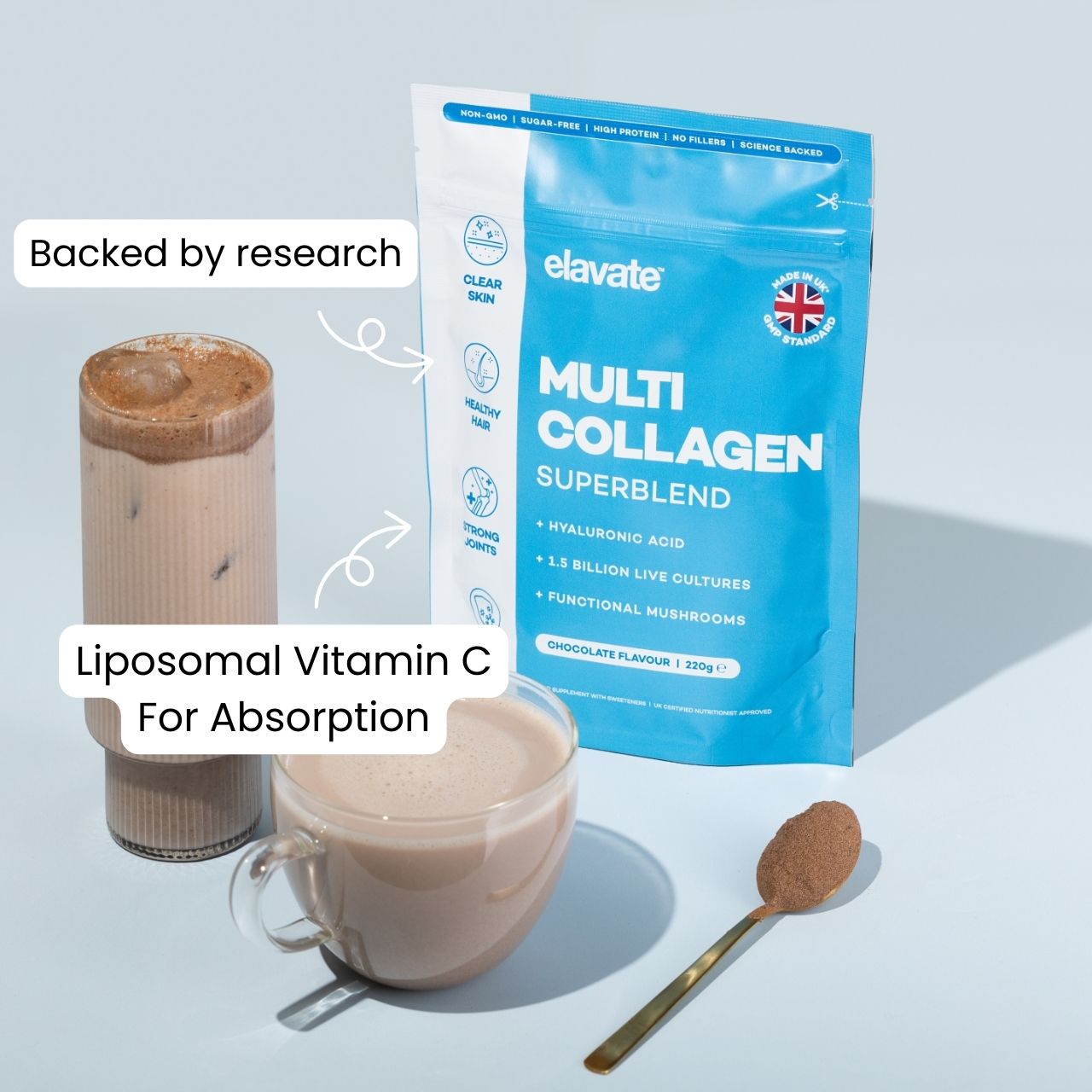 Elavate is made with real cocoa powder, blended with premium multi-sourced collagen for a rich, indulgent drinking chocolate you can feel good about.