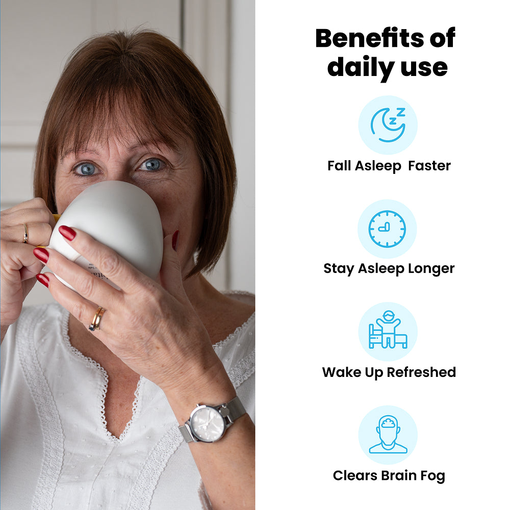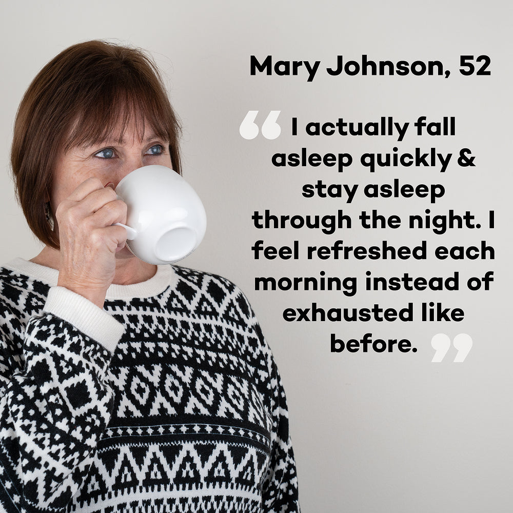 Ich bin 58 und leide seit den Wechseljahren unter Schlafproblemen. Nach nur drei Wochen mit Elavate Better Sleep schlafe ich tatsächlich die ganze Nacht durch! Ich wache nicht mehr um 3 Uhr morgens auf und starre an die Decke. Ich wache mit dem Gefühl auf, tatsächlich geschlafen zu haben! Mein Mann sagt auch, ich wälze mich nicht mehr hin und her!