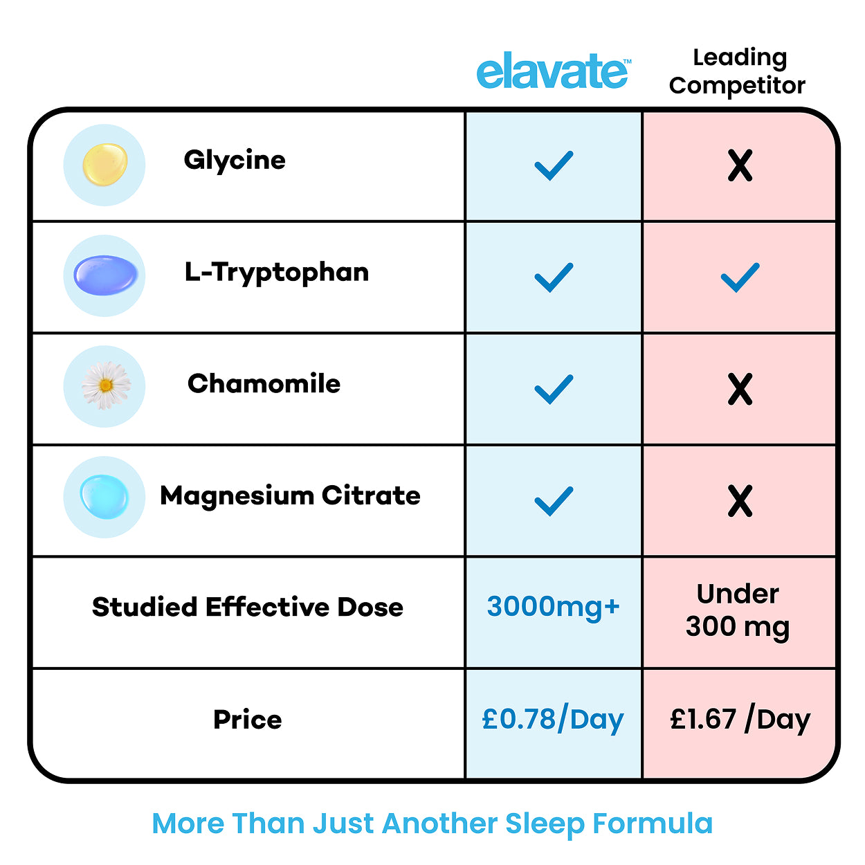 Schlafergänzungsmittel unterstützen den natürlichen Schlafzyklus Ihres Körpers. Die Mischung von Elavate geht jedoch noch einen Schritt weiter und verwendet Inhaltsstoffe, die zusammenwirken, um alle drei Schlafphasen anzusprechen: Einschlafen, Durchschlafen und erfrischtes Aufwachen.