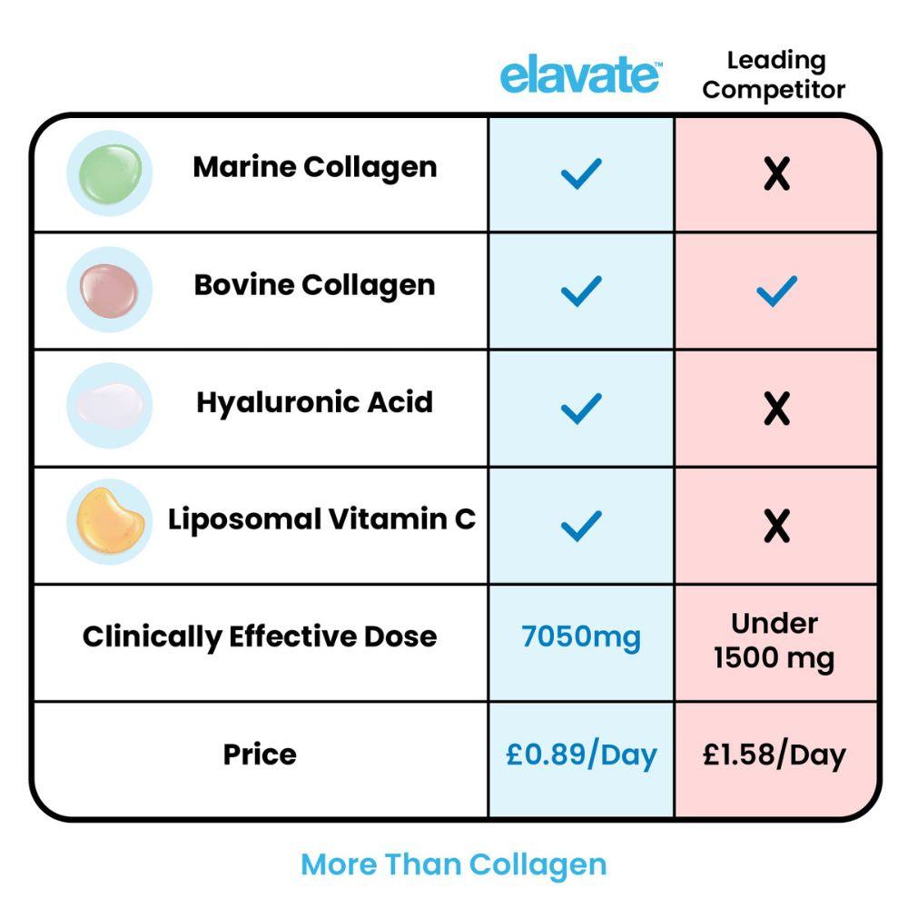 Kollagenpräparate wirken, indem sie den natürlichen Kollagenspiegel in Ihrem Körper erhöhen. Die Mischung von Elavate geht jedoch noch einen Schritt weiter und verwendet Inhaltsstoffe, die Signale an Ihren Körper senden, um seine eigene natürliche Kollagenproduktion anzukurbeln .