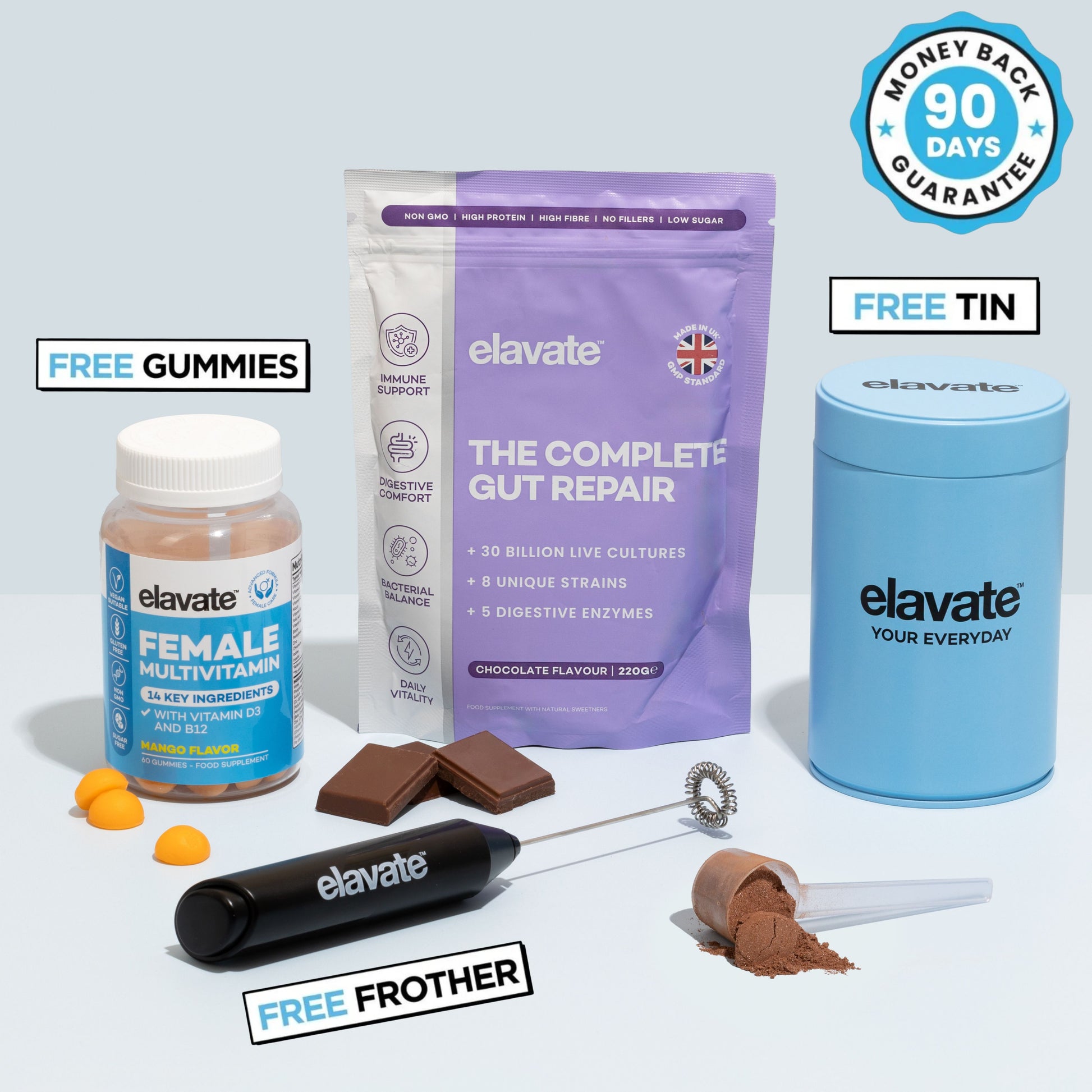 Elavate hat einen köstlichen natürlichen Schokoladengeschmack und schmeckt am besten, wenn es mit warmer Milch gemischt wird, wodurch eine cremige heiße Schokolade entsteht!